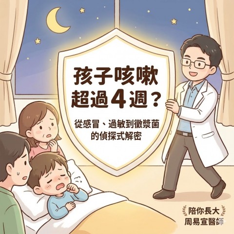 孩子咳嗽超過 4 週怎麼辦?從過敏、黴漿菌到肺炎,竹北兒科醫師教你判斷是否照X光 作者:陪你長大小兒科診所 周易宣 醫師 「醫師,他已經咳了快一個月了,藥吃完就好一點,停藥又開始咳,是不是肺有問題?」這是...