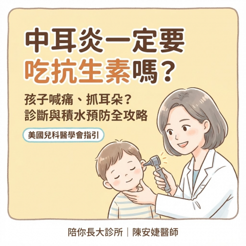 中耳炎一定要吃抗生素嗎?孩子喊耳朵痛的診斷、治療與積水預防全攻略 作者:陪你長大小兒科診所 陳安婕 醫師 (衛福部耳鼻喉科專科醫師、前林口長庚耳鼻喉部總醫師) 「媽媽,我耳朵痛痛的...」當孩子半夜哭著抓耳朵...