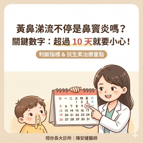 孩子黃鼻涕流不停是鼻竇炎嗎?超過 10 天是關鍵!症狀判斷與抗生素治療重點 作者:陪你長大小兒科診所 陳安婕 醫師 (衛福部耳鼻喉科專科醫師) 「醫師,他的鼻涕黃黃綠綠好久了,是不是鼻竇炎?」在竹北的冬天,每...